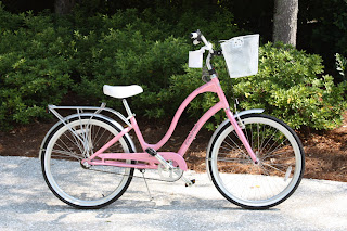 The pebbled stone pathway could work as a natural massage on your feet in a shower floor bathroom.How fun is this bike? It reminds me of when I was a little girl biking to the beach with all of our gear. Why not use this color as inspiration for the little girl's room?